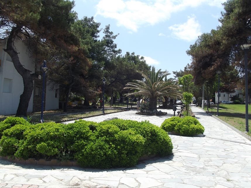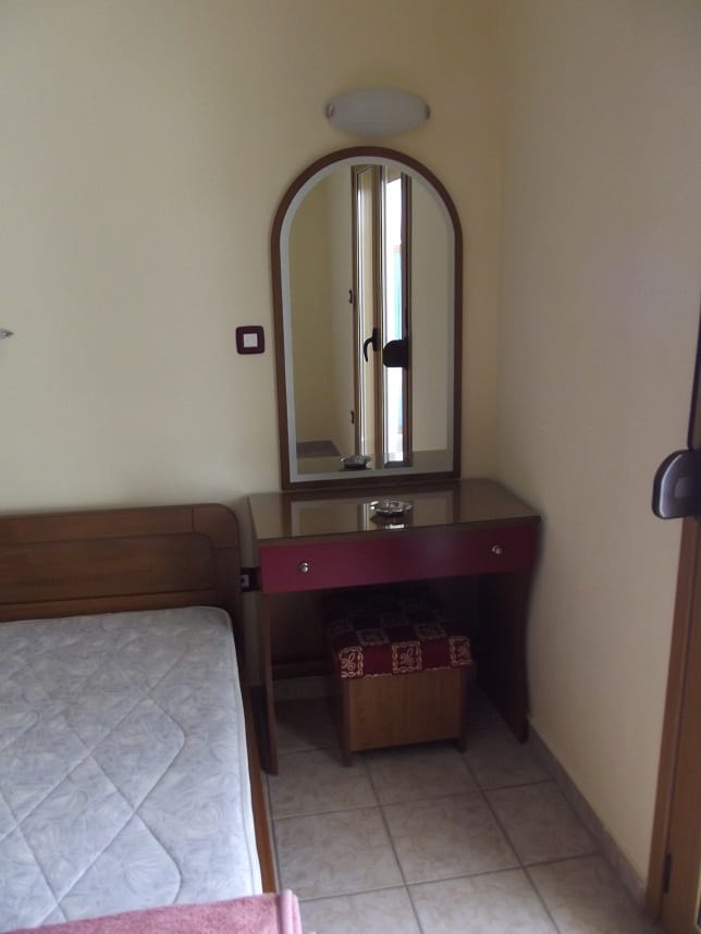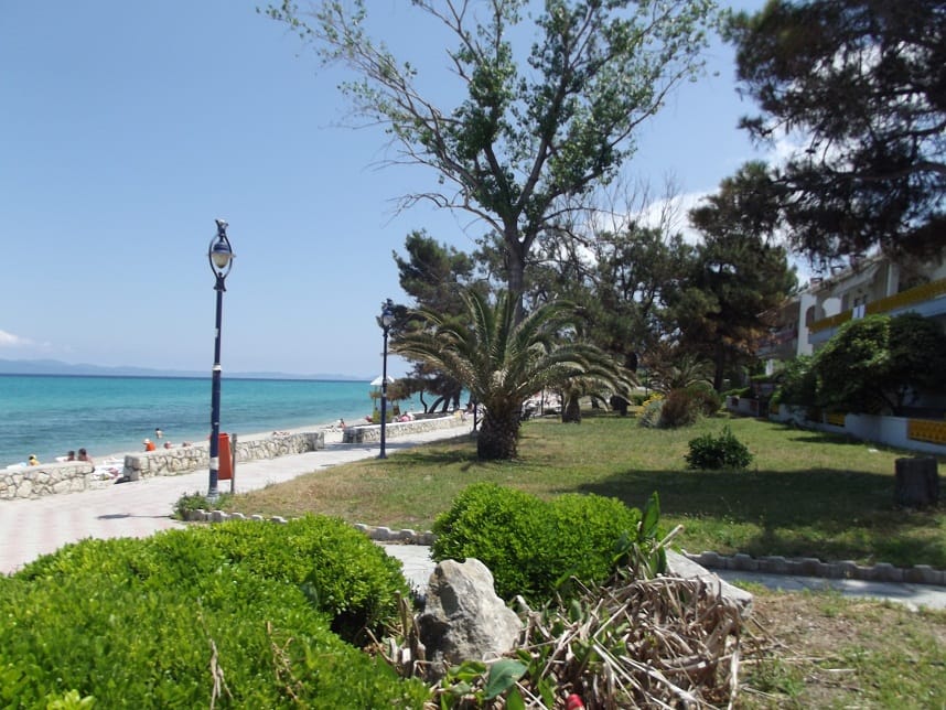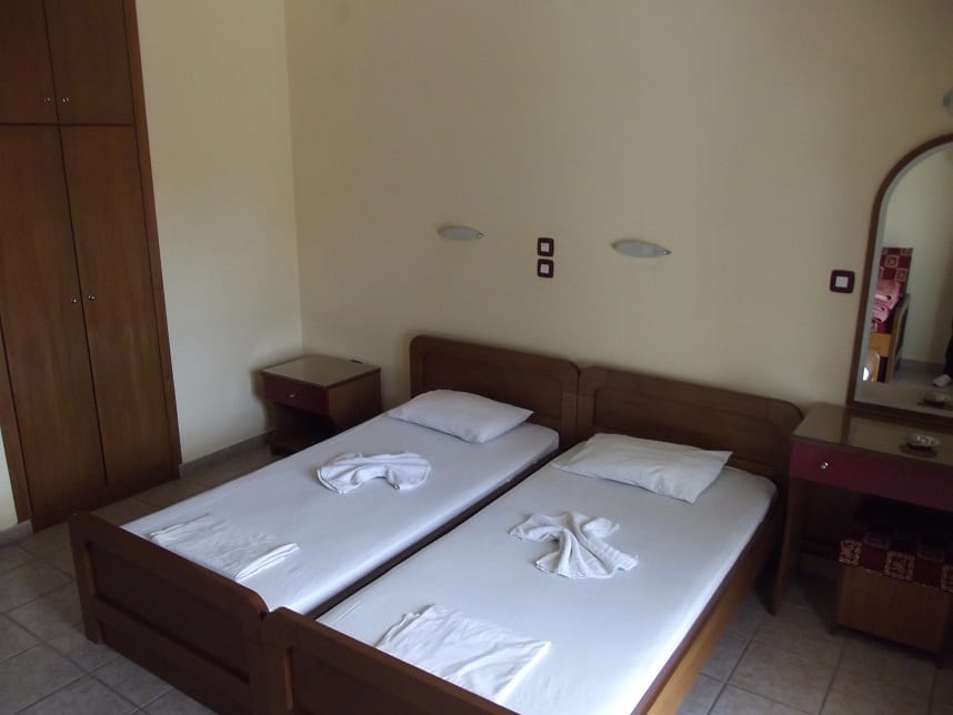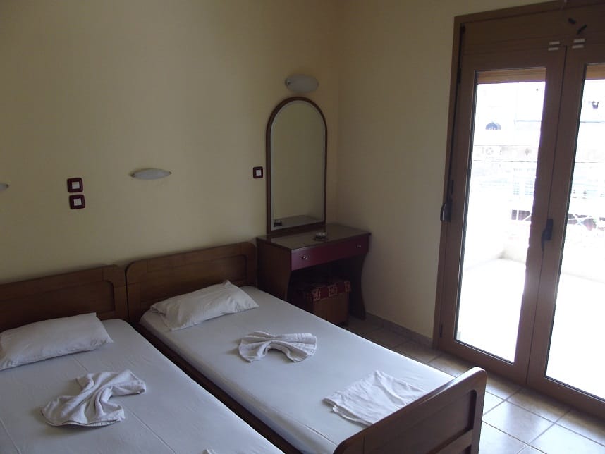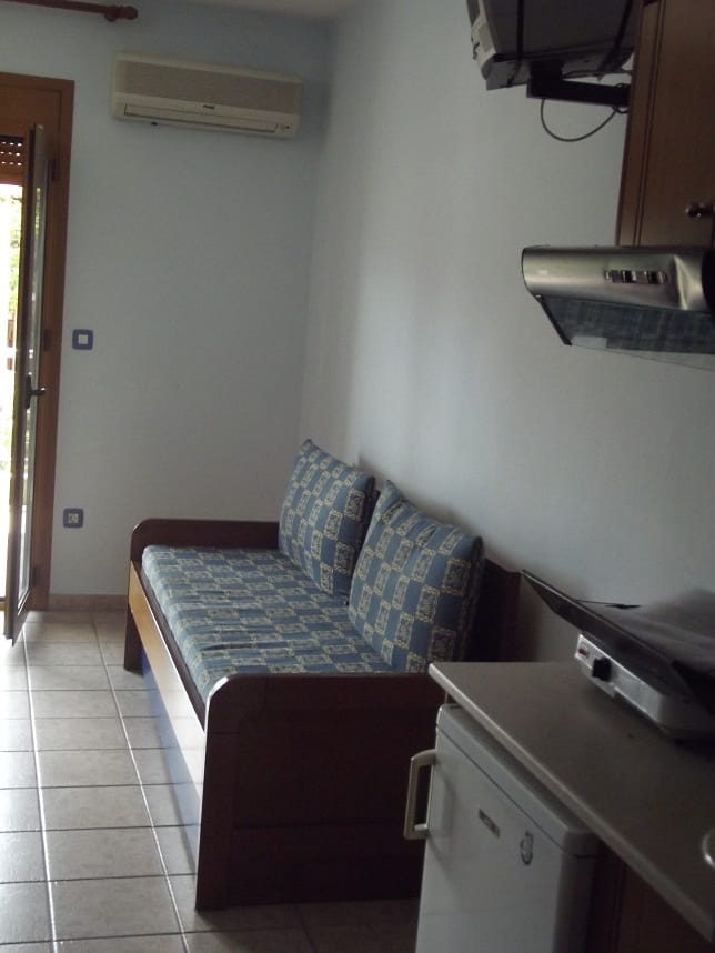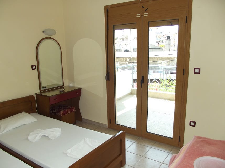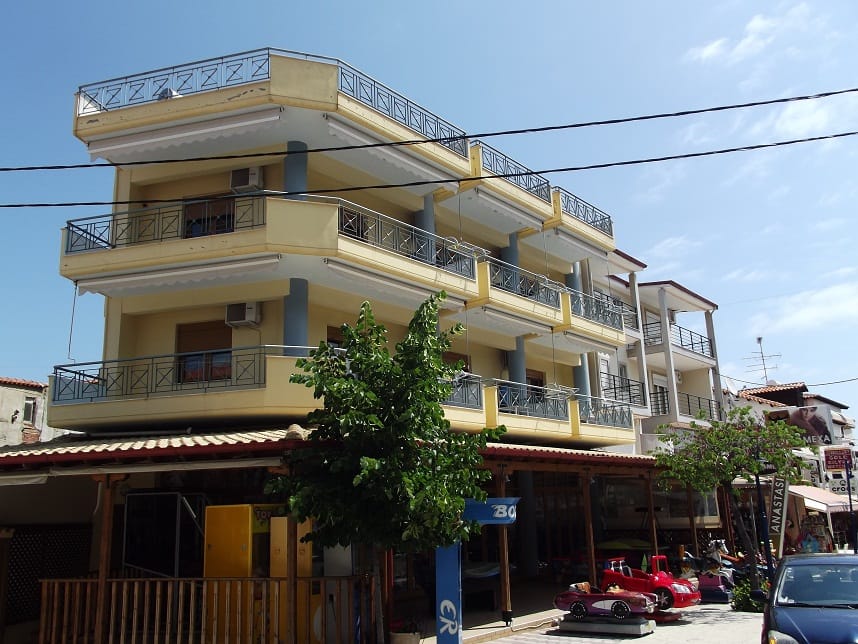 Вила “Maria” се наоѓа на одлична локација во центар на Ханиоти, односно на самиот плоштад и нa oколу 150m oд плажа. Располага со 1/2 – 1/3 студија со редовни легла како и 1/3+1 студио со три редовни легла и едно на извлекување (поставени нови душеци на секое легло во 2021). Сите студиа се комплетно опремени со: кујна (со комплетен прибор за онолку лица према број на легла + аспиратор, фрижидер…), тоалет, крпи за лице и тело, клима (БЕСПЛАТНА), ТВ, како и бесплатен интернет, гардеробер, сушара, широки балкони со тенди за сонце и масичка со столчиња со поглед на плоштадот, кон многуте барови, ресторани, продавници.. Студиата за две лица се наоѓаат на први и втори кат и имаат поглед назад, останатите студија поглед напред.