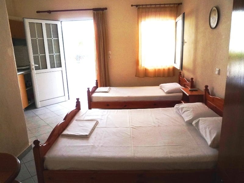 Вила “VANGELIS” се наоѓа на 150m од плажа, веднаш до хотел “Eleni” под главиот пат и пругата во центар на Лептокарија. Располага со двокреветни и трокреветни студија, апартман со една спална за 5 лица и дуплекс апартман со две одделни спални соби за 5 лица. Во двокреветните студија има 2 единечни легла и се наоѓаат на високо приземје и први кат, во трокреветните има еден брачен и еден единечен кревет на први кат, во апартманот со една спална има еден брачен во спалната, и еден брачен и еден единечен во кујната. Овој апартман се наоѓа на високо приземје, додека во дуплекс апартманот со две одделни спални соби има три единечни во едната спална и две единечни во другата спална и дневна со кујна. Сите студија/апартмани се комплетно опремени со: кујна (со комплетен прибор за онолку лица према број на легла, фрижидер…), тоалет, огледало, туш, балкон (масичка со столчиња), клима, ТV, гардеробер. На располагање на гостите е бесплатен интернет и прекрасно уредени двор со парк кој ги воодушевува сите кои случајно или намерно минуваат покрај вилата.